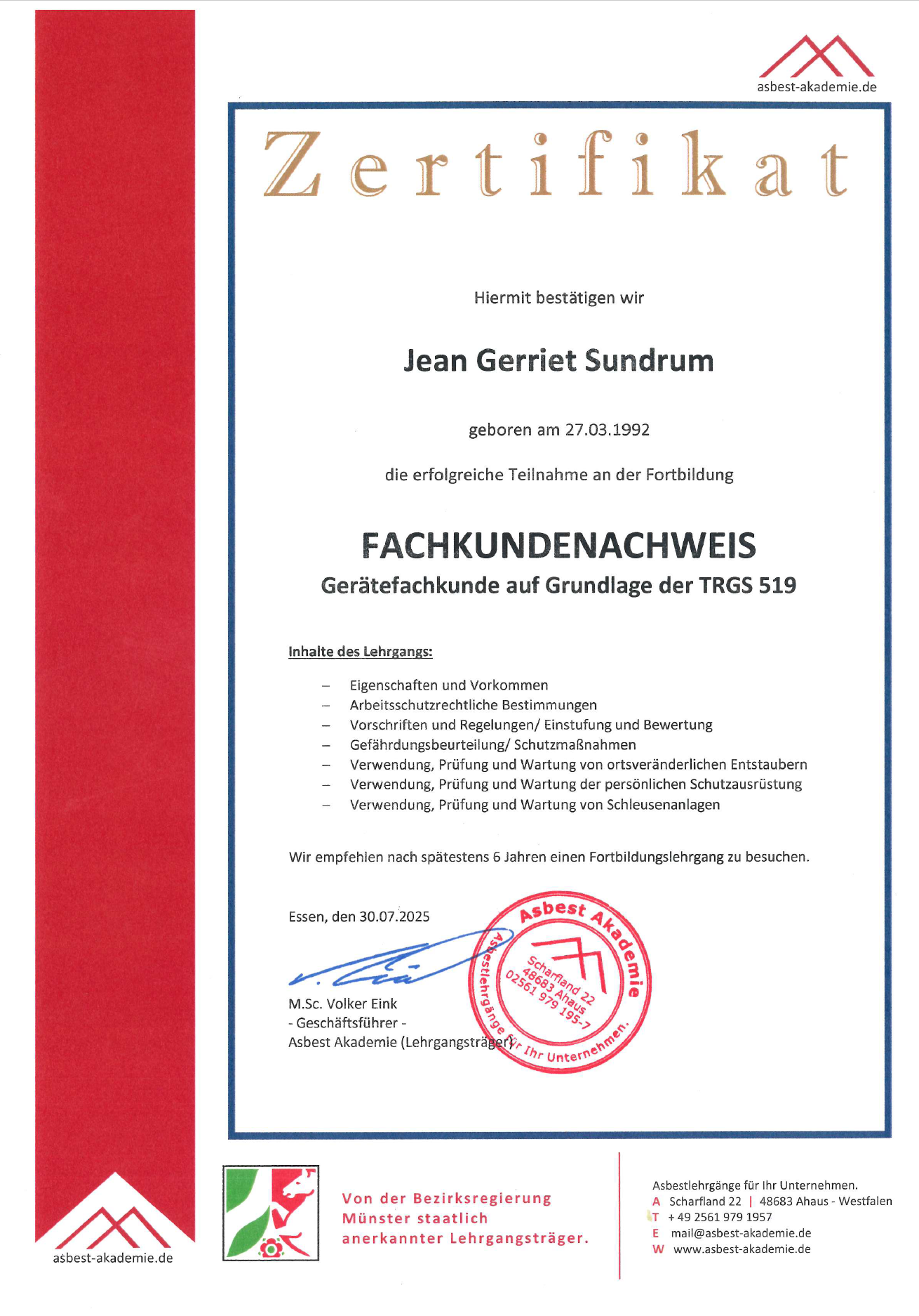 Um Ihre Wünsche optimal umsetzen zu können, verfügen wir über eine motivierte Mannschaft mit einem breiten Spektrum an Qualifikationen und Zertifizierungen. Auf der Basis einer soliden handwerklichen Ausbildung wurden spezielle Qualifikationen erworben wie beispielsweise zum Führen von Baumaschinen oder für die Entsorgung von Asbest. So haben wir für Ihre Ansprüche die passenden Mitarbeiter: Der mit unserem lasergestützten Messverfahren umzugehen weiß bis zum Mitarbeiter, der dem Abbruchobjekt zeigt, wo der Hammer hängt.